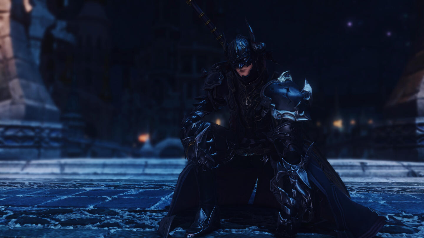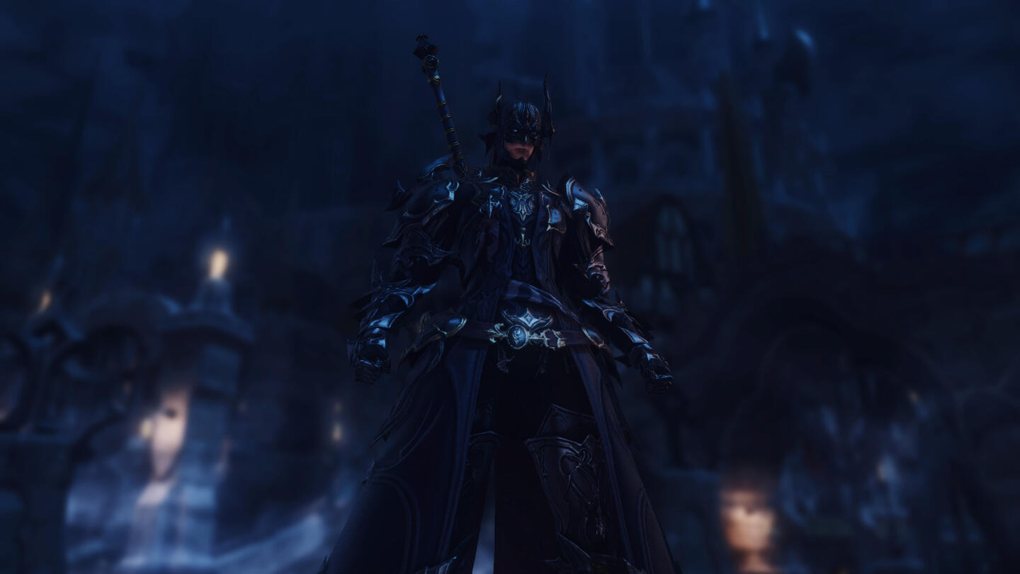 Nightwind is a mighty and powerfully built silhouette, having honed his form near to physical perfection over the many decades. He towers over others at 6 fulm, 10 ilm, with eyes of a fierce blue. He walks with a purpose of the utmost kind, and never is he seen without the foreboding plate armor of Nightwind.Dyed dark purple, black, and silver, with accents of gold, the armor is of exquisite make, forged years ago in the fires of Ishgard. The armor, which covers his entire form, is primarily comprised of layered plate atop leathers and a suit of chainmail, with several adornments of cloth for embellishment and personal taste.His chosen weapon, like all that walk the path of the dark knight, is a massive greatsword. His is a storied weapon with a fearsome blade, adorned with geometric patterns and runic engravings, and it is never far from his reach.